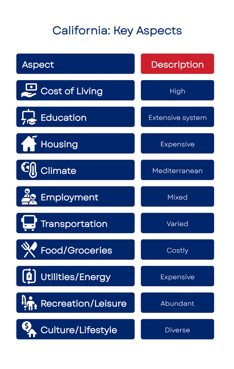 This summary outlines the key aspects of living in California, from economic factors to lifestyle, helping prospective residents make informed decisions.