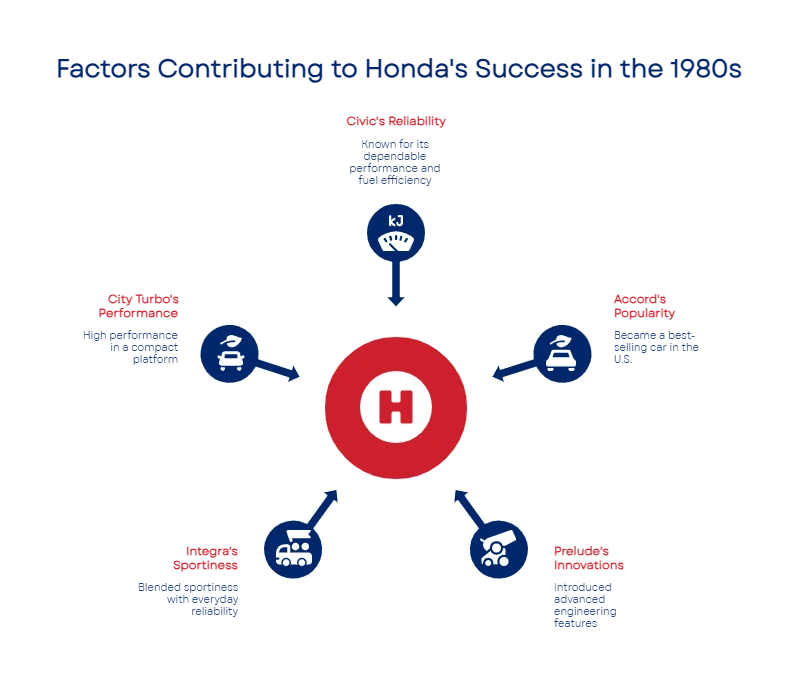 These are the specific Honda vehicles that defined the decade with their features and popularity, such as the Civic, Accord, and Prelude.