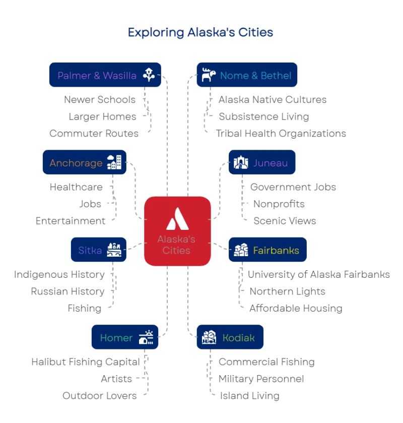 These locations offer a balance of services, employment, and access to healthcare, similar to urban areas in the lower 48 states, with the addition of Alaska's natural beauty and outdoor activities.