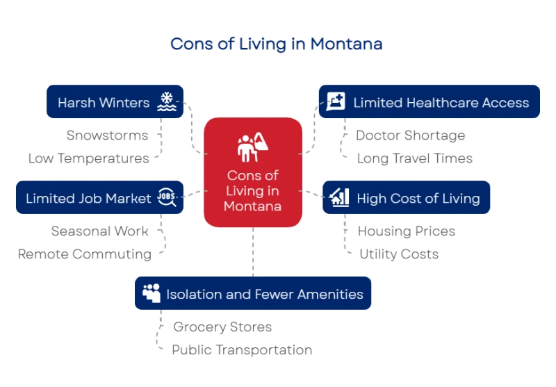 Living in Montana, especially in rural areas, may involve fewer services, entertainment options, and longer distances to stores and healthcare.