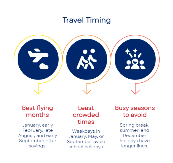 Best Times for Lower Crowds and Prices: Traveling during off-peak months such as January, early February, late August, and early September can result in lower airfare, hotel prices, and shorter lines.