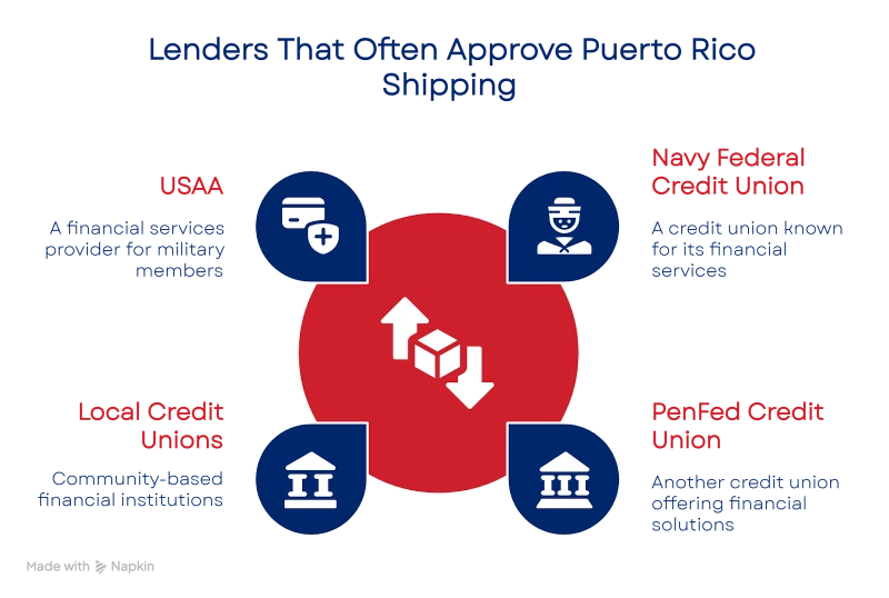 Major banks like Bank of America, Chase Auto Finance, Toyota Credit, and Wells Fargo typically deny these requests. They view Puerto Rico differently than mainland states for risk assessment purposes.