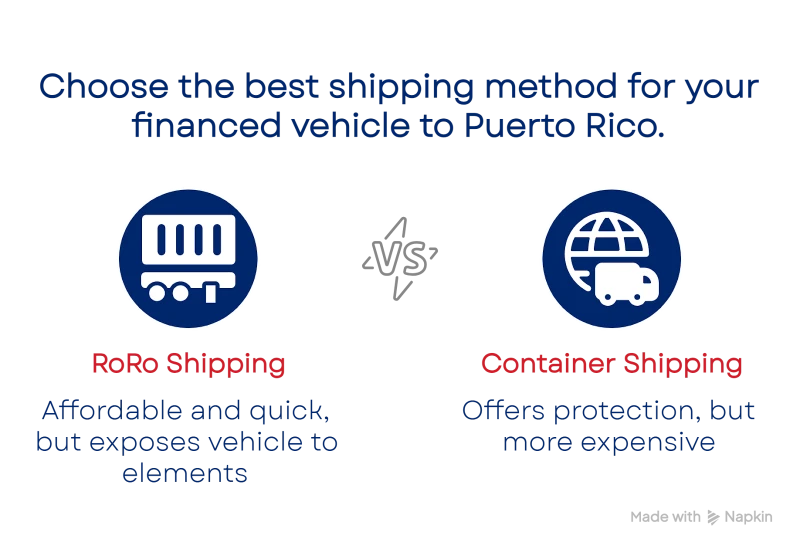 Two primary shipping methods transport vehicles to Puerto Rico: Roll-on/Roll-off (RoRo) and container shipping.